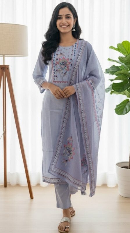 The kurta is adorned with a beautiful, with digital floral print that blossoms across the fabric, lending a fresh, vibrant, and nature-inspired aesthetic. Indulge in the luxurious comfort and timeless elegance of our premium Modal Silk ensemble. This three-piece set is designed to offer a graceful silhouette and a gentle, buttery-soft feel against your skin, making it perfect for long hours of wear.